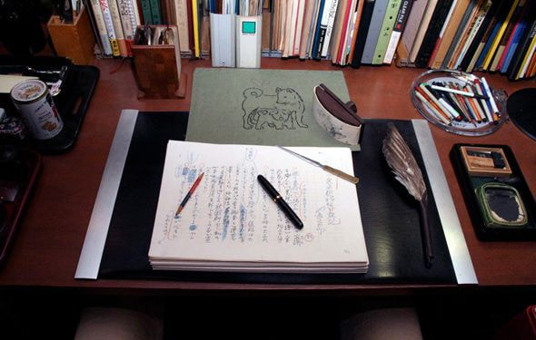 书斋桌子上的笔筒里放有画笔,在桌角附近放有速写本,颜料和调色板等画具和画笔等,能够想象出他在小说的构想和创作累了的时候,会从速写或绘画中来获取灵感。