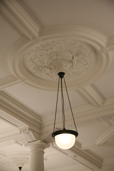The columns in the Gallery of Children's Literature are wrapped with "Takekomai," a bamboo structure wound into steel frames, and finished with plaster. The decorations of the columns are made by filling plaster into molds, removing the plaster before it hardens, and putting it on the surfaces. Also, the decorations on the ceiling are depicted by plasterers with trowels. The decorations were restored in the same method as those of at that time, and the technique was passed on to the next generation.