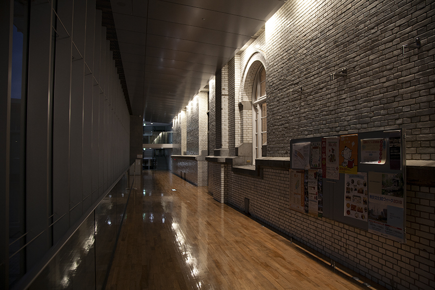 벽돌 동의 창에는 메이지 시대 창건 당시의 유리가 남아 있습니다. 약간 요철이 있는 메이지 시대의 유리를 통해 부드러운 빛이 들어옵니다.