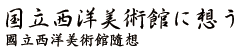 國立西洋美術館的主要館藏建立在被稱為松方收藏為基礎上。在大正3年(1914)前後開始到昭和3年(1928)前後,當時任株式會社川崎造船所的社長已故的松方興次郎氏,在歐洲各地收集的繪畫和雕刻,後來被稱為松方收藏。第二次世界大戰後的昭和26年(1951)簽訂的舊金山和平條約中,松方的收藏被歸為法國政府所有,就在該條約進行簽署的時候,當時的吉田茂首相出面對法國提出了歸還這些收藏品的要求。在昭和28年(1953),法國提出將建立(法國美術館)作為歸還這些藝術品的必須的前提條件,同年12月關于創立《法國美術館》的事宜得到內閣會議認可後,設置了籌備協議會。昭和29年(1954),內閣會議決定該館作為國立美術館,要在上野公園重建。《國立法國美術館》的設計工作由勒•柯布西耶擔任,日本方面的設計合作者確定為坂倉准三、前川國男、吉阪隆正等三人。昭和33年(1958),當時的法國首相戴高樂通過行政命令的方式,認可了松方收藏的返還。昭和34年(1959)1月正式簽字,同年6月,(國立西洋美術館)正式開放。(下段繼續)