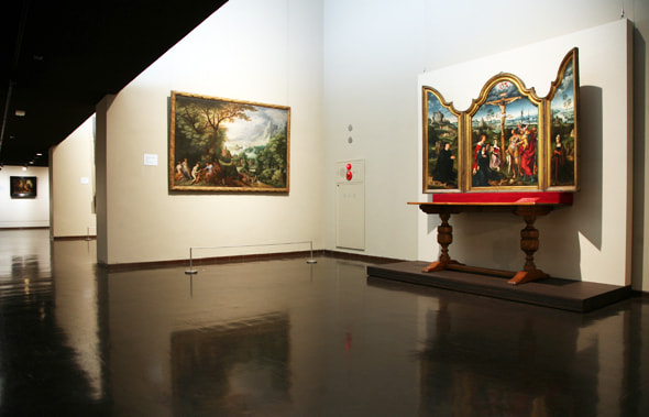 14-16世紀的繪畫展區(主樓2層) / 朱爾斯•凡•克萊夫《三聯祭壇畫•十字架上的基督》(16世紀初葉、右)、吉利斯•凡•柯甯克斯洛(《巴黎的審判》裏表現的山嶽風景)(16世紀末-17世紀初葉、左)