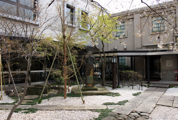 在書法博物館的庭園裏,不折的銅像被鮮花錦簇著。為了體現他曾經是一位西洋畫家,在他的手裏握著調色板和畫筆。