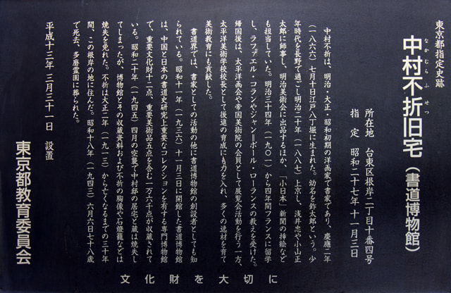 台東區立書法博物館,是由西洋畫家兼書法家的中村不折用了40余年將近半生的經曆的個人收藏,在中國以及日本的在書法史研究上都具有重要收藏意義的專門博物館。書法博物館自開館以來的60年中,一直是由中村家族來維持•保存的,在平成7年(1995)12月捐贈給了台東區。其後在平成12年(2000)4月作為台東區立書法博物館重新面向社會開放。它以原建築為本館,捐贈後又加建了中村不折紀念館組成。同館作為中村不折舊居,被東京都定指為指定史迹。(台東區根岸2-10-4)