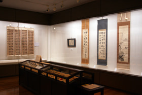 中村不折記念館一階の第一展示フロアーにある大型展示ケースには、長幅の作品を展示しています。