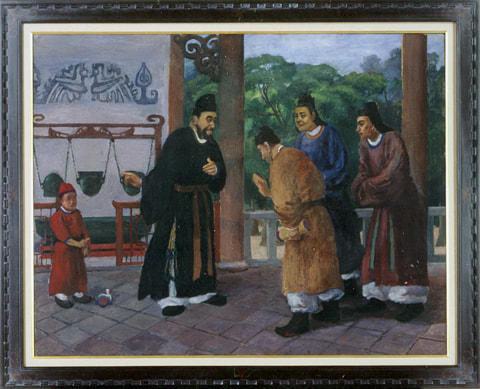水を満たすと覆る猗器(画面左)を人間の高慢な心にたとえた、中国春秋時代の故事を題材とした作品。画面中央の人物は孔子である。