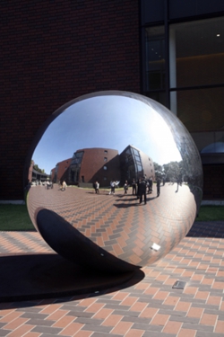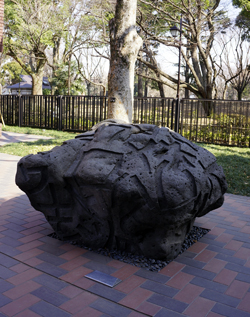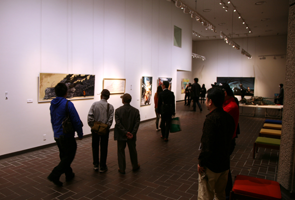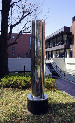 进入美术馆正门后,在迎面扩展开来的“洄游大道”上展示着井上武吉的作品-一个巨大的金属球体,它已经成为这座美术馆的标志物了。可以这样肯定的说凡是来到这个美术馆的人,都会先去窥视一下那个穿过阳光下闪闪发光的球体的孔洞。井上武吉的作品在东京都厅(新宿)的都民广场上也有展示,画着红拱的巨大作品《my sky hole 91 tokyo》,并也成为了都厅的标志物。