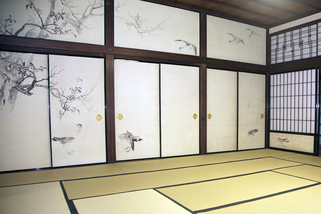 Pine trees are depicted on the walls of the tokonoma alcove, and plum trees are widely depicted on the sliding doors partitioning this room from the next room. Also, bamboos are depicted on the shoji screens with wooden panels in the lower part and on the walls of the staggered shelves, making a composition of so-called "Sho Chiku Bai," or a pine, a bamboo and a plum. These sliding-door pictures were stored in a storehouse in order to preserve the cultural properties, and visitors could not see the building's original state for a long time. Also, pictures on the paper pasted onto the walls had some preservation problems. Therefore, a research team, which would make reproductions of the pictures, was formed in 2005, and worked with Dai Nippon Printing Co., Ltd. to produce reproduction pictures by utilizing digital image processing technology. In 2007, 37 pictures by Okyo Maruyama and 4 pictures by Shurei Yamamoto were reproduced, and the pictorial space was restored to the original state.