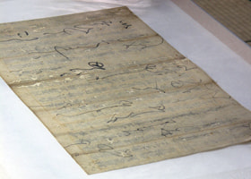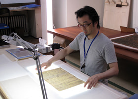 神庭: 今説明ありましたように、虫損が著しいということ、本来の場所が動いている可能性があること、経典の裏に書かれたものであるということを念頭におきながら、今後どのような処置をしていくかを考えながら、このように内部構造を見て、過去の修理方法や構造、接着状況など料紙を事前調査している段階です。(右上段に続く)