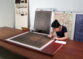 神庭: 当館の地下には様々な部署がありますが、保存修復課も本館の地下にあり、修理室も本館地下に集中しています。これからご案内する修理室は、日本やアジアの絵画や書跡などの美術品を修理する部屋です。伝統的な(そうこう)技術を用いて作品を修理しています。手前におりますのが、鈴木さんでこの道20年程のキャリアです。その後ろが沖本さんでこの世界で8年程のキャリアです。今2人が取り組んでいるのは、当館所蔵の書跡と絵画(両界曼荼羅)の修理です。