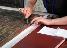 神庭: 現在行っている作業は本格修理ですが、ここでは本格修理だけではなくて、応急的な修理を行います。応急修理と言うと、その後に本格が待っているように聞こえますので、対症療法の対症修理と呼んでいます。症状が現れたらそれに合わせて行う修理を本格修理以外にも多く行っております。今日は二人とも本格修理に取り組んでいますが、毎日ずっとという訳ではなくて、様々な掛け軸、画帖、折り本、絵画、書籍、浮世絵などの様々なジャンルや形態を、またわずかな傷みがあるものをその場で迅速に手当てしています。状態に合わせて速やかに処置を行っていくということが重要でして、いずれ行うからしばらく放っておくと段々傷みが進んで行きますので、可能な限り速やかに手当てして、本格修理は避けられるような状況を作り出すというのが対症修理を行う目的です。(次ページに続く)