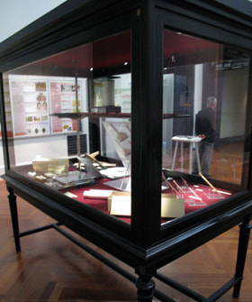 神庭: 中央に展示されているものは、修理に使う道具や材料です。下半分に見えている道具類は、絵画や書跡といった文化財を修理する際に使われる、(そうこう)技術で使う包丁、紙、へらなどを展示してあります。その後ろ側には、作品を展示する際に使う調湿剤や免震装置の模型などを展示しています。そしてさらに特長がありますのは、この展示ケースそのものです。歴史的価値のある展示ケースですが、明治時代にイギリスから輸入されて展示室で利用されていたものです。このような古い展示ケースも、ディスプレイの歴史の中では歴史的価値を持っています。それを現代の展示に耐えるよう改装して再利用しているわけです。
