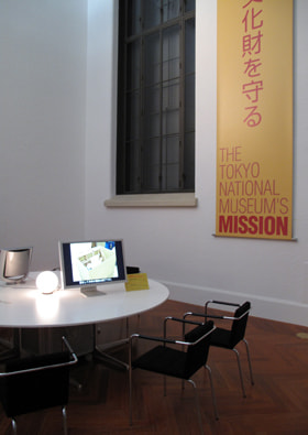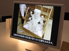 神庭: このコーナーでは文化財の輸送、修復作業について紹介しています。二つのプログラムがございまして、文化財の輸送作業と振動調査というプログラムが一つ、今ご覧頂いているのがそれです。これから仏像をトラックに乗せて奈良まで運ぼうとしているところですね。この番組の後に、絹に描かれた絵画、玄奘三蔵像の修復というプログラムがもう一つございます。いずれのプログラムも、英語バージョンと日本語バージョンがありまして、結構外国から来られたお客様も座ってご覧になっていることがありますね。このように、東京国立博物館が行っている文化財の保存に関する取り組みを、色々な面から紹介しているのがここ17室です。先ほどの実物の作品については、定期的に展示替えをしております。また右側の歴史的展示ケースにつきましては、今後またリニューアルをしたいと計画しております。数年に一度は全体を模様替えができればと思っています。(次ページに続く)
