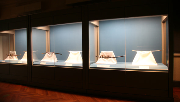 神庭: ここは刀剣を展示しているコーナーです。刀剣は熱心なファンの方がいらっしゃる世界ですね。国宝の太刀、このように太刀の姿が綺麗に残っていますね。これは、平安時代(11世紀)の作品です。これは重要美術品です。この太刀は、鎌倉時代(13世紀)の作品です。これも刀身の形が非常に綺麗に残っていますね。これも鎌倉時代13世紀の太刀です。いずれも今から700年以上前のものですね。こういった太刀が現在でもきちっとした形をもって、それも金属が錆びでるのではなく、光って残っているということは、考えてみれば大変不思議なことではあります。太刀、あるいは刀は鉄でできておりますから、大変に錆びやすいものです。放っておけばすぐに錆びて全体が茶色くなり、そして一部分は金属が溶けます。ですから、刀や太刀はそうした状態にならないために、始終手入れをしなければなりません。もし手入れを怠り錆びたら、そこを研がなければいけませんね。そういうことを平安時代から今日までの間、何回繰り返すかによって刀の減り方が違ってきます。始終錆びさせたものは、刀がどんどん減っていきます。しかしここに展示されている太刀や刀は、あまり研ぎ減っていないと考えられております。それは何を意味するかと言いますと、始終点検をして、錆びないように手入れがされていたという証拠なんですね。もしそういう手入れや点検がなされなければ、これらの太刀は今、針のような細い姿でここに展示しなければならないくらい、細くなっていたと思います。