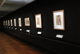 神庭: 本館の第10室は、浮世絵と小袖と、簪(かんざし)類、つまり江戸近世の町方の風俗を扱う展示コーナーです。こちらの面にありますのが、浮世絵ですね。向こうの面にありますのが小袖です。小袖と浮世絵が同じ部屋にあるのは、まさに近世町方の風俗を代表するものだからということの他に、保存的な観点から大切なことがあります。どちらも天然の染料を使っているということです。天然染料で小袖は染織されています。一方、浮世絵も天然染料を用いて刷られているんです。浮世絵は紙に天然染料、もちろん顔料も使っておりますけど、小袖は絹に天然染料、どちらも繊維に対して天然染料を使うということで、非常に似た性格です。いずれも光に対してとても脆弱な作品です。天然染料は強い光に当たると褪せて消えてなくなり易いものです。浮世絵と小袖が一緒に置かれていることは、どちらもある程度の暗さに置くということで、保存の観点からもとても良いコーナーになっているのではないかと思います。