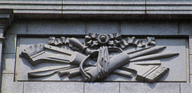 建物の正面外壁の上部には、製図用具や楽器をモチーフとした装飾が配されています。
