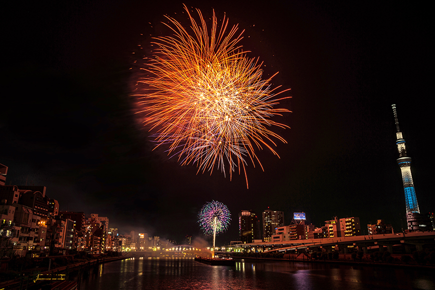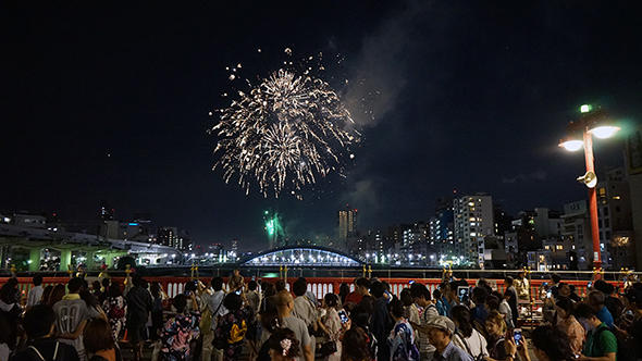 每年在7月末舉行隅田川焰火大會時,都會有近百萬人參加,這在東京都內各地舉辦的焰火大會中也屬于大規模的,當天還有電視台進行實況轉播。燃放焰火被分爲兩個會場,在隅田川上的櫻橋和言問橋之間設立的是第一會場,在駒形橋到廄橋之間開設的是第二會場,兩個會場交相呼應地競相將焰火投向夏夜高空,還進行焰火比賽。從1978年(昭和53)到現在共舉辦過40回了,隅田川焰火大會已經成爲東京夏天一道絢麗的風景