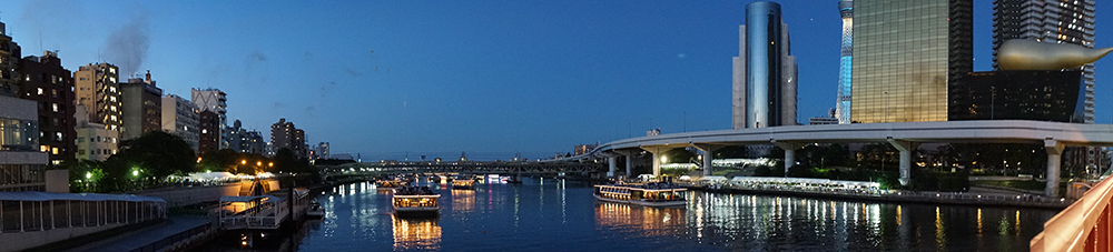 每年在7月末举行隅田川焰火大会时,都会有近百万人参加,这在东京都内各地举办的焰火大会中也属于大规模的,当天还有电视台进行实况转播。燃放焰火被分为两个会场,在隅田川上的樱桥和言问桥之间设立的是第一会场,在驹形桥到厩桥之间开设的是第二会场,两个会场交相呼应地竞相将焰火投向夏夜高空,还进行焰火比赛。从1978年(昭和53)到现在共举办过40回了,隅田川焰火大会已经成为东京夏天一道绚丽的风景。