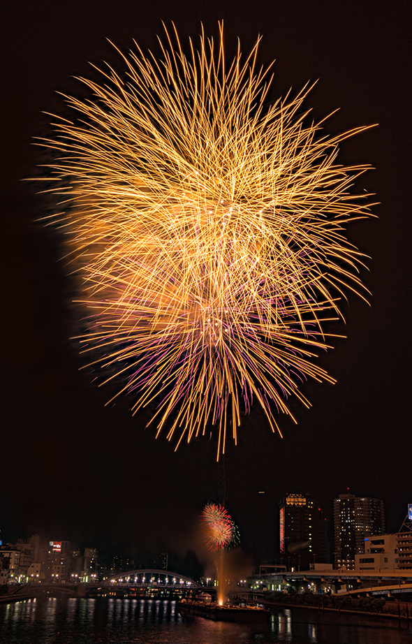 매년 7월에 개최되는 스미다가와 불꽃 대회는 도쿄의 불꽃놀이 중에서도 매회 100만 명에 가까운 인파가 몰리는 큰 행사로써, 방송으로 생중계도 이루어지고 있습니다. 스미다가와에 놓인 사쿠라바시부터 고토토이바시 사이에 설치된 제 1회장과 고마카타바시에서 우마야바시 사이에 마련된 제 2회장의 두 곳에서 경연이 이루어지는 불꽃 콩쿠르가 개최됩니다. 재개된 쇼와 53년(1978)부터 40회째를 맞이하면서 도쿄 여름의 풍물이 되었습니다.