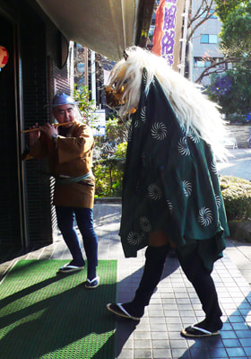 獅子和大黑天,新年期間一天也不休息,在台東區內各處巡回極其繁忙。笑臉迎福。(元月二日)