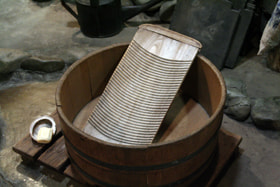Ishii: The front side and back side of this washboard have different patterns. If you touch it, you can understand that you have to sit in an uncomfortable position when washing clothes. The side facing up is used for washing. The opposite side is used for rinsing. Bubbles run down towards the flanks of the washboard, so it is very functional. When you turn the washboard upside down, bubbles are kept. It is not appropriate if bubbles run down during the first stage of washing. The washboard was not used since early times because it was imported from the West. It is said that the washboard became widely used in the Taisho Period. For example, if this washboard is displayed in a showcase, the exhibition effect is entirely different. However, it is displayed in this way so that small children can also figure out the washing position and the difference between the front and back sides. I think the historical meanings and value of exhibits can be indicated through such experience. [continued in the lower column]