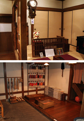 Ishii: A beckoning cat figure is placed here. That is a counter, and this side is a workplace. Products were manufactured here, and transaction fees were calculated at the counter that was a sacred space where only an owner and head clerk of a merchant house could sit in. The figures of the beckoning cat and God of Wealth were popular ornaments in a merchant house. A big-headed dwarf figure was also placed in some cases. It was a good-luck token. The stairs leading to the second floor of this merchant house is a reproduction, so visitors can not actually go up the stairs. Most merchant houses facing streets were two-story buildings. In a merchant house of this size, there were six to seven servants. The second floor was used for a room of live-in servants. Only the entrance room of the merchant house is reproduced due to the structural limitation of this museum. [continued in the lower column]