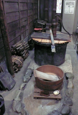 井戸はありますけれども、水道の蛇口がありませんので、この吊手水器(つりちょうずき)が手洗いの道具になります。この中に水を入れて、シャワーのように水が出て手を洗うことができます。