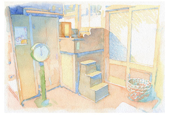 정겹게 느껴지는 목욕탕의 카운터, 대야를 옆구리에 낀 아주머니가 포렴(布簾)을 들어 올리고 들어올 것 같습니다. (그림: 토츠카 하루나)