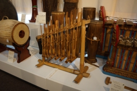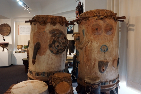 采訪之際,展示室裏展示著200到250件左右來自世界各地的太鼓。中央部分是日本的太鼓,進入入口後的右手邊是中南美的太鼓,左手邊是非洲的太鼓,正對面的裏面展示陳列著中東、歐洲、亞洲圈的擁有各種各樣表情的太鼓。展示品的解說上都貼著標記,紅色標記表示樂器不可以觸摸,貼有音符符號的標記是可以隨便觸摸和敲打演奏的。