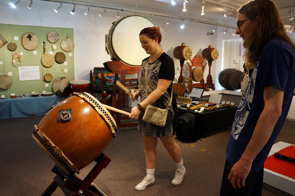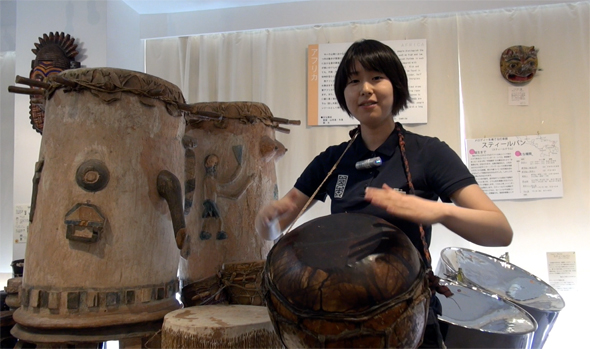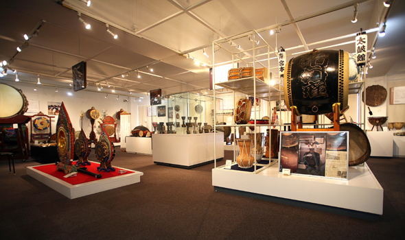 采访之际,展示室里展示着200到250件左右来自世界各地的太鼓。中央部分是日本的太鼓,进入入口后的右手边是中南美的太鼓,左手边是非洲的太鼓,正对面的里面展示陈列着中东、欧洲、亚洲圈的拥有各种各样表情的太鼓。展示品的解说上都贴着标记,红色标记表示乐器不可以触摸,贴有音符符号的标记是可以随便触摸和敲打演奏的。