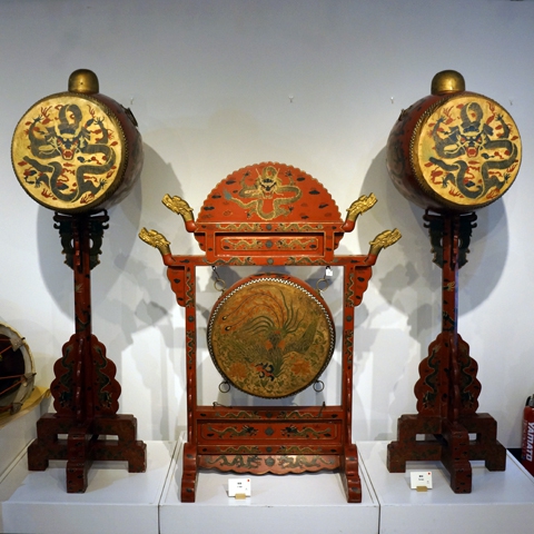 左右一对的是建鼓,中央的叫做架子鼓。建鼓的鼓面上画着有5个爪子的龙。龙的图案在中国的清王朝只有皇帝和皇后才可以使用,由此或许能让人联想到这鼓的出处。在亚洲圈,固定鼓膜皮革的大部分都是用铆钉,这也是包括日本在内的东亚一带的共同特征。