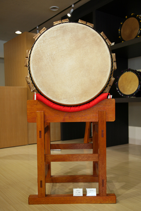 私どもの所にありますが、組み立てると高さは8m程もあります。この太鼓は、当時私どもが受注したのではなく、父が意気に燃えて作ってしまったんですね、それをオリンピックの組織委員会に提供したんです。それで使って頂いた後は、無用の長物に等しい状態で、10年程は倉庫に眠っていました。それで昭和60年(1985)頃かな、その間も雅楽団体は、宮内庁の楽部程度で、日本国内には数少なくて、NHKさん等が雅楽公演する際に一番使って頂きました。