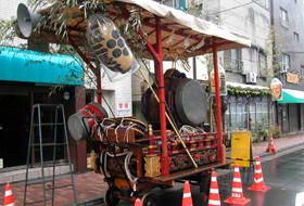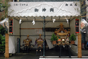 鸟越神社的大神兴“千贯神兴” 在组装现场的天棚上装饰着威武升天的龙。 街道会的神轿是由街道会的人们用亲手组装起来的。通过施展各不相同的精巧手工技艺,神轿在他们的手中变得造型各异,表现丰富,华丽细致。 在组装现场的天棚上装饰着威武升天的龙。