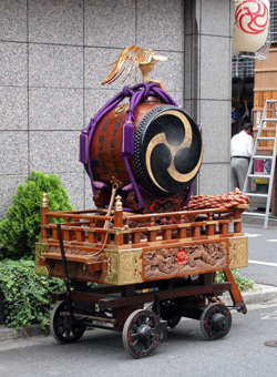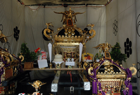 도리고에 신사의 큰 미코시 ‘센간 미코시’ 뼈대가 조립되는 곳의 천정에는 웅장하게 승천하는 용의 모습이 있었습니다. 쵸카이의 미코시는 쵸카이 사람들의 손으로 조립됩니다. 미코시는 점점 그 화려한 모습을 드러냅니다. 각각 화려한 세공이 가해져 다양한 표정을 보이기 시작합니다. 뼈대가 조립되는 곳의 천정에는 웅장하게 승천하는 용의 모습이 있었습니다.