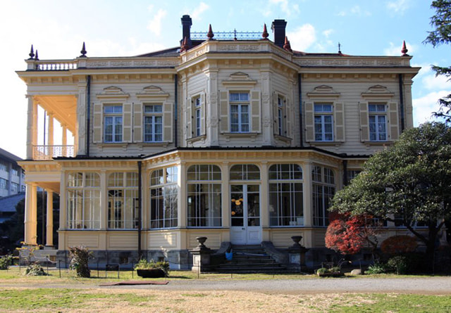 旧岩崎府邸,是于明治29年(1896),在东京下谷茅町(现台东区池之端)建造的日西合璧的三菱创立者•岩崎家族的府邸,在江户时期又曾成为越后高田藩•榊原和明治初期的旧舞鹤藩•牧野等人宅邸,在设计上其沿袭了大名园林式的点景石、灯笼、假山等,与广阔的草坪一起共同构筑了这座近代园林日西合璧、品位高雅的府邸。刚竣工时,在这块15,000坪的建筑用地上共建造了20余栋的建筑,现存的三栋是一个两层楼房和带地下室的西洋馆以及连接着西洋馆的日本馆的一部分和稍微离开正房一些距离的台球室。在昭和36年(1961),西洋馆和台球室被指定为重要文物,在昭和44年(1969),日本馆的大广房间和围墙,以及平成11年(1999),包括宅地和砖围墙在内的府邸全部进行了实测,其实测图也被指定为重要文物。