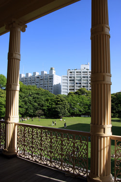 松井: 洋館と和館の一部だけが残っています。戦後に米軍に接収されて、その後昭和28年(1953)に国の所有になり、その後法務省の管轄になり裁判所の書記官研修所として利用されました。敷地内には、和式住宅は部屋数40から50部屋ほどあったのではないでしょうか。研修生が2年間寄宿して学び、そして全国の裁判所などに散っていく。それが19期生までですかね、30数年間ほどずっと使われました。ところが戦後、裁判所の職員が不足した時期に、職員を増やす事になり、いくら大邸宅でも収容できなくなり、大きな建物を建てなくてはとなり、和館のほとんどを取り壊してしまってビルに変わってしまいました。それが昭和44年(1969)ですね。それでも収容できなくなって、今度は平成6年(1994)に和光市に移転し、その移転費用を捻出するために、この敷地を一部売却してしまって、当時の3分の1ほどになってしまいました。ですから、久彌氏が造った明治を代表する芝庭と洋館の取り合わせである和洋併置式の庭園が、米軍接収、そして法務省管轄の時期からすべて壊されて行ったのですね。(下段に続く)
