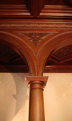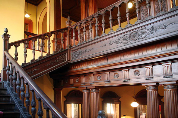 二階へと上がる回廊にも似た階段にもジャコビアン様式の意匠が見受けられます。