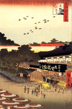 从江户到明治的变革期,再到大正与昭和,还没有能象上野树林(在日语中,特指神社周边的树林为杜,所以上野周边寺庙周围的树林也称为“上野的杜”)这样,能够如此追溯历史足迹的地方。而上野宽永寺就是其中心。在江户时期,它不仅作为将军家的菩提寺,而且上野山下的周边地区也作为寺庙街一起得到了繁盛。在歌川广重(安藤广重)所画的《江户百景》中,生动地记录下了当时的繁荣景象。