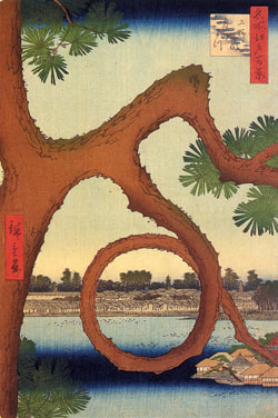 上野弁財天近くにあった「月の松」を通して、本郷界隈を望む。前掲の松が独特の形として描かれ、その表現も絶妙です。