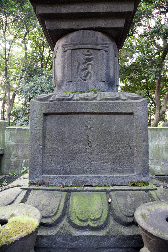 There are inscriptions "Kanshoin" and "Jushii Iga Shosho Fujiwara Takatora" on the side of the tombstone.