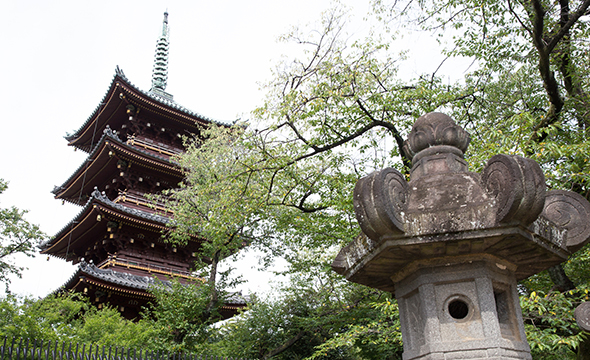 寛永寺は、江戸時代から永らく徳川将軍家の祈祷所、菩提寺として徳川将軍家歴代の将軍の内、6人が祀られていますが、第二次大戦後は霊園も新たに造成されました。寛永寺の現在の境内地は約3万坪、根本中堂、本寺を初めとして、開山堂、辯天堂、パゴダ、徳川霊廟、清水観音堂、そして子院十九坊から成っています。戊辰戦争で焼失を免れた清水観音堂、輪王寺門跡御本坊表門、徳川将軍霊廟勅額門等は重要文化財に指定され、江戸の往時の趣きを残しています。(下段に続く)