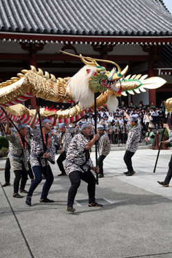 金龍舞是因爲淺草寺的山號叫“金龍山”而得名的舞,1958年(昭和33)爲紀念正殿的重建而創始敬奉的。《淺草寺緣起》上說,觀音示現世時“寺邊的天空中有金龍從天而降,一夜之間化做千棵的松林(是現世五谷豐登的象征)”。扮作松林的是來自淺草寺幼稚園的小朋友們組成的松慈童,和一名象征觀音菩薩的“蓮華珠”,再由8個人操縱著金龍(長18米,重約88公斤)做守護。在淺草工會花組的伴奏聲中,跳著雄壯華麗的金龍舞。