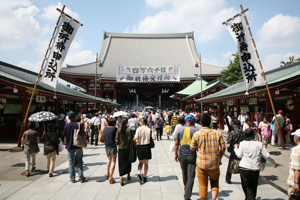 每月18日浅草寺有观音庙会,此外从室町时代开始又设置了新的节庆日叫做“功德日”。每个月如果选这一天来参拜的话,就能获得相当于一百天,一千天的功德。7月10日被称作“四万六千日”,其功德就是4万6千日,相当于大约126年的功德。四万六千日的由来,据说是因为装满一升枡(古代的一种量器,可装一升的米或酒等物。)的米需要大约46000颗米粒,于是用一升比作一生。参拜者们借此祈祷长寿和无病无灾。