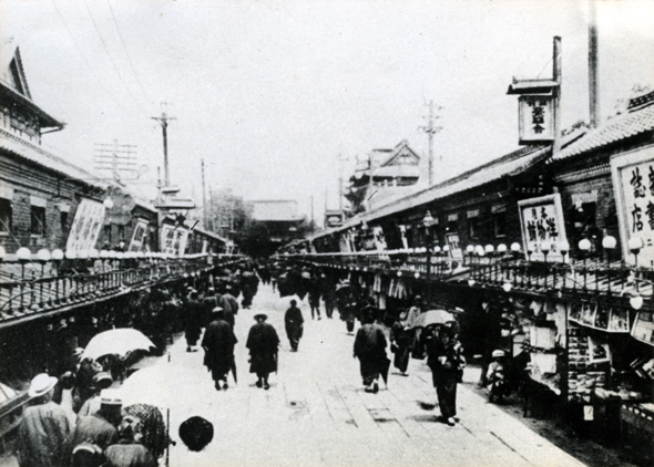 Nakamise shopping district around 1920. Stores are decorated with lights.
