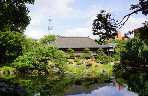 The garden had been kept secret from the public for a long time. In addition to the buildings, the planting of trees and the natural environment are also valuable. Now, the Tokyo Sky Tree can be seen beyond the garden, creating a harmony between the old and the new.