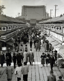 大正9年(1920)頃の仲見世、出店には電飾が並んでいます。