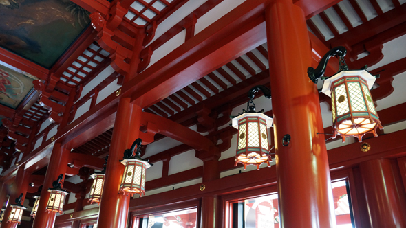浅草寺本堂外陣天井には、中央に川端龍子画「龍之図」(1956)、左右に堂本印象画「天人之図」(1957)が描かれています。