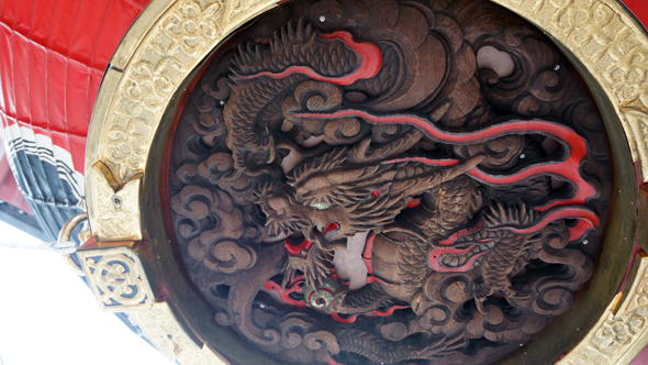 카미나리몬에 걸린 큰 제등은 지름 3.3m, 높이 3.9m, 무게 700kg에 이르는 거대한 것으로, 제등 하단에는 금룡이 조각되어있습니다.