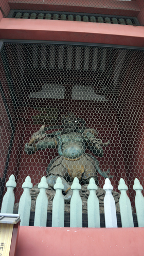 카미나리몬 정면 좌측에는 뇌신이, 오른쪽에는 풍신이 모셔있습니다만, 게이오 원년(1865)의 대화재로 머리만을 남기고 소실되어 메이지 7년(1874)에 시오카와 렌교쿠씨의 보각으로 복원되었습니다. 카미나리몬 뒷면에는 히라구시 덴츄의 ‘천룡’, 스가와라 야스오의 '금룡' 두 마리의 용신이 모셔있습니다.