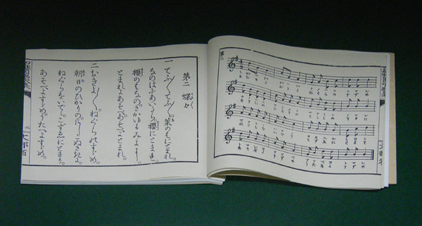 This book was edited in parallel with the elementary school songs, copyrighted in July 1887 and published in December 1887. It contains 29 songs, including "Cho-cho," "Kasumi ka Kumo ka," "Uzumaku Mizu (Kira-kira Boshi)," "Mitsubachi," "Kazoe Uta." Shown here is a page of "Cho-cho."