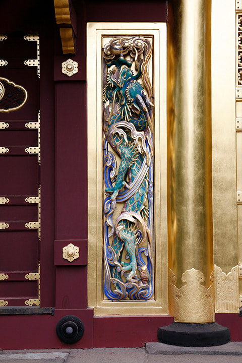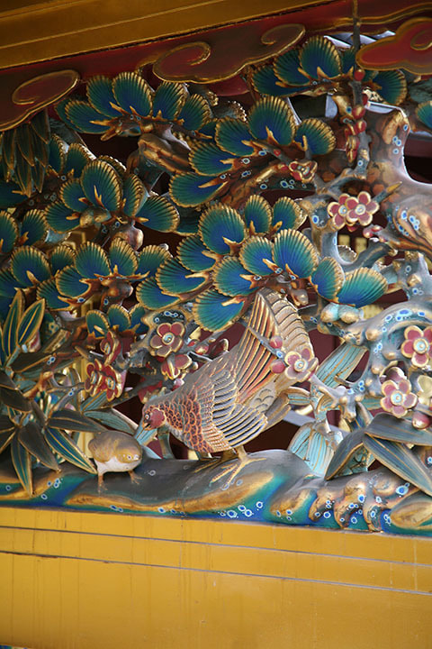 The gate is officially called "Kara Hafu-zukuri Simon-kyaku," or Chinese-style gabled four-post gate, and designated as a nationally important cultural property. Relieves of rising and descending dragons by Jingoro Hidari, a carver in the early Edo Period, are carved on the both sides of the gate. Openwork of golden and flower pheasants are placed at the top of gate, and cuckoos related to a Chinese legend are engraved on the inside of the gate.
